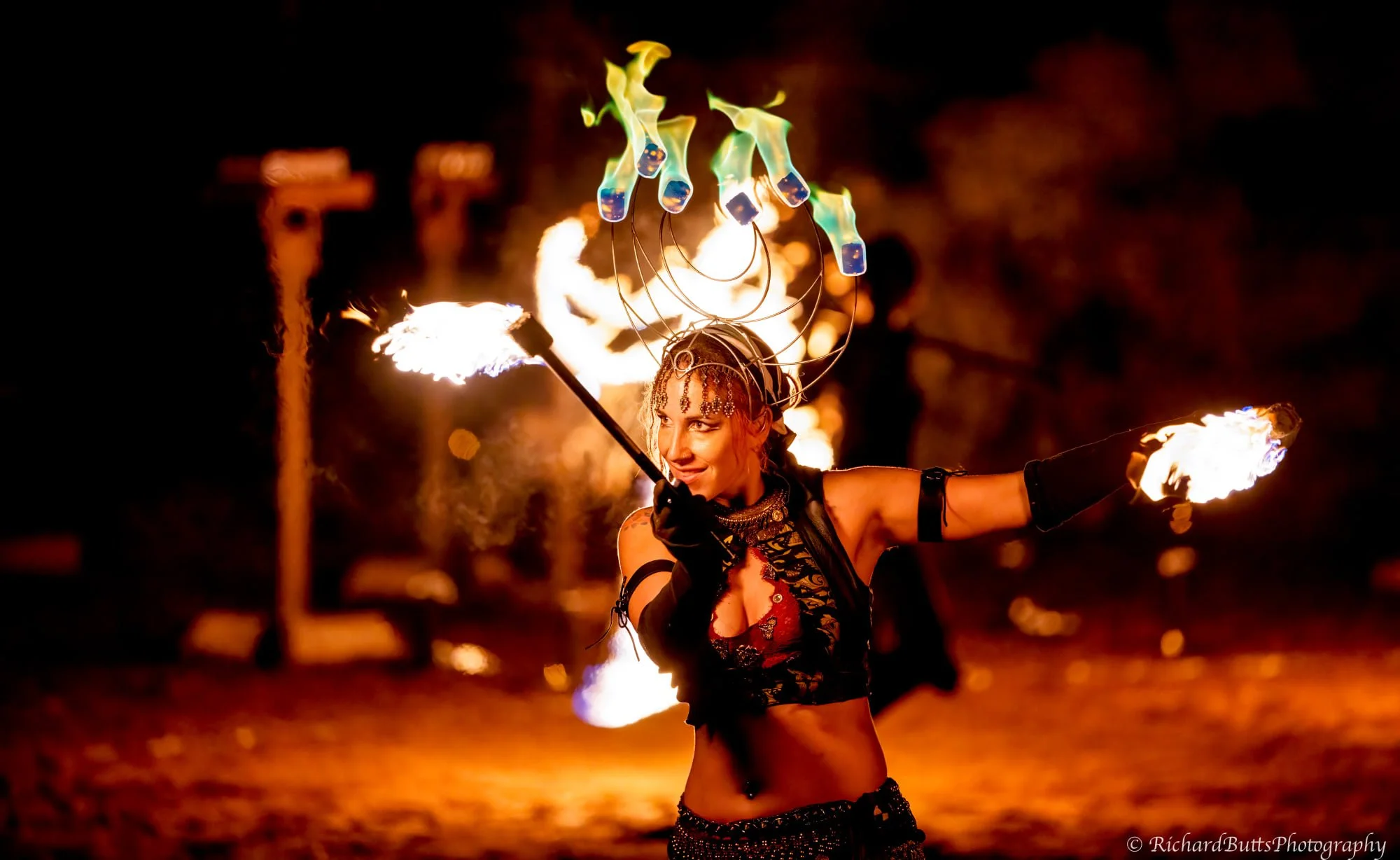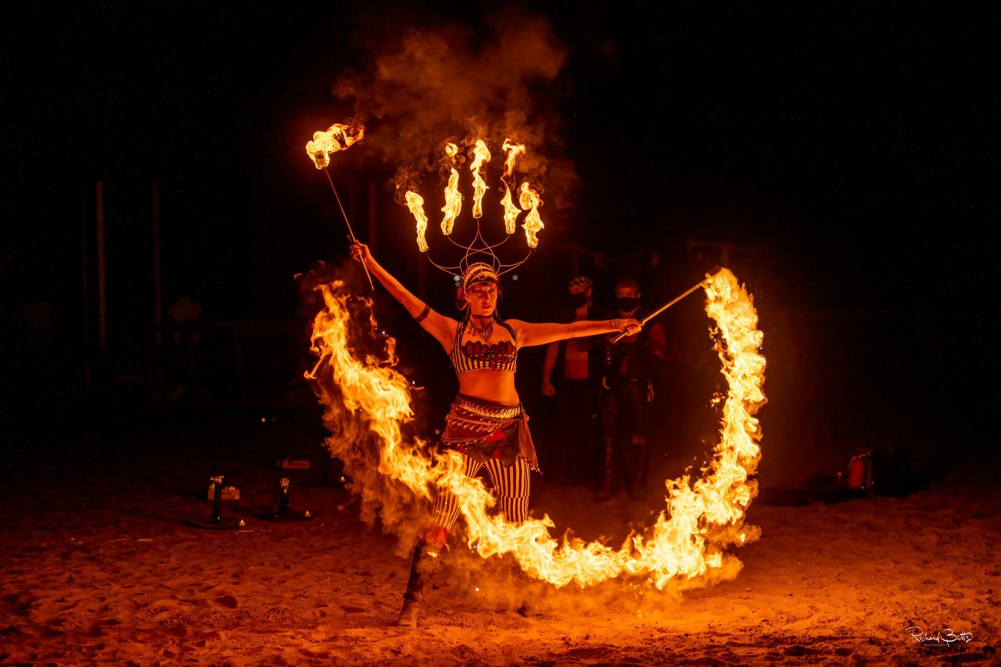 Let Journey light up your event with her many LED and fire tools such as: poi, staff, fans, fire breathing, fire eating, circus hoops and more.