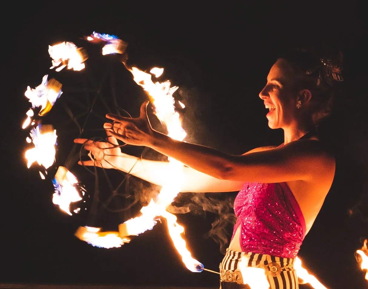 Journey provides dazzling and daring fire shows fit for any event including weddings, bachelor/bachelorette, Christmas, New Years, kids parties and more. With over 15 props to choose from we can make each show unique. All booked fire shows will also include a safety assistant to accompany the performer. Insurance for the venue is available upon request. While there are many fire dancers to choose from, it’s critical to consider the experience level and safety knowledge of your dancers as this can be dangerous if done incorrectly!
